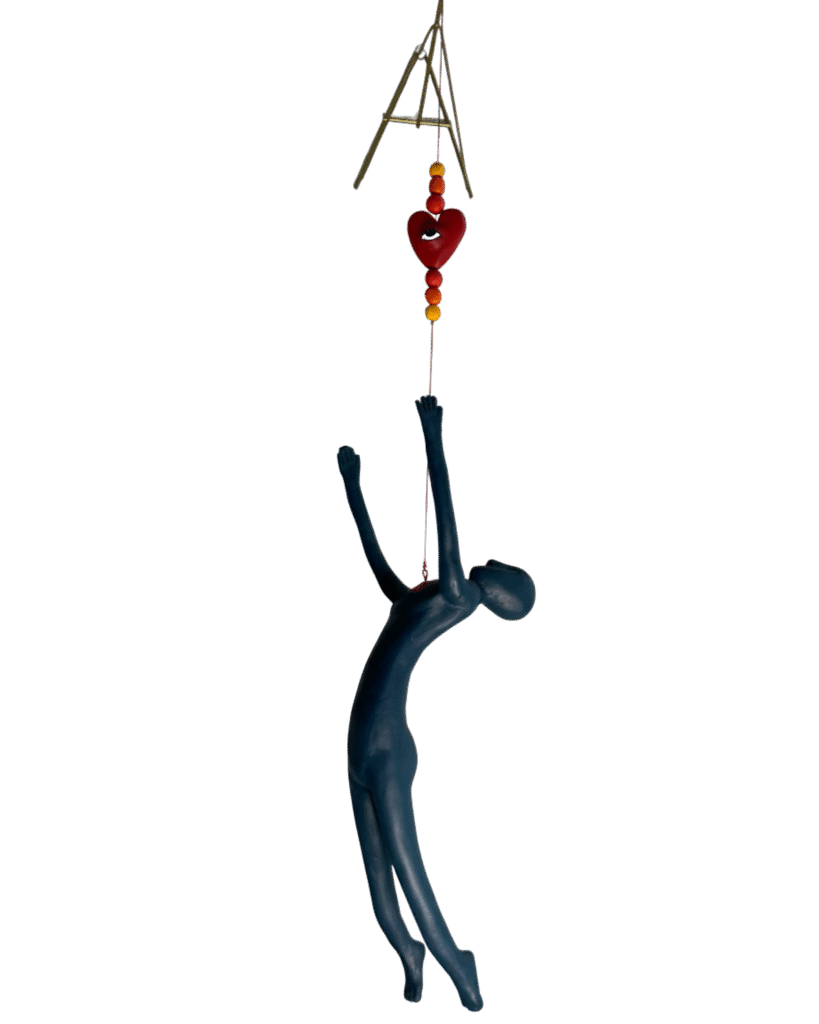 Suspenso no ar, ele toca quase o coração que brilha acima dele.